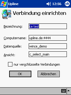 Das Demo ist für die Geräte DOLPHIN 7400 von Hand Held Products und PPT 2800 von Symbol Technologies vorbereitet und zeigt auch die Unterstützung der Barcode Scan Engine. Bitte das File nach IPSM\AutoInstall kopieren und wie unter Windows CE üblich installieren. Das Gerät muss Zugang zur IP-Adresse 213.183.3.195 (upline.de) haben und zu Socket 4444 konnektieren können.